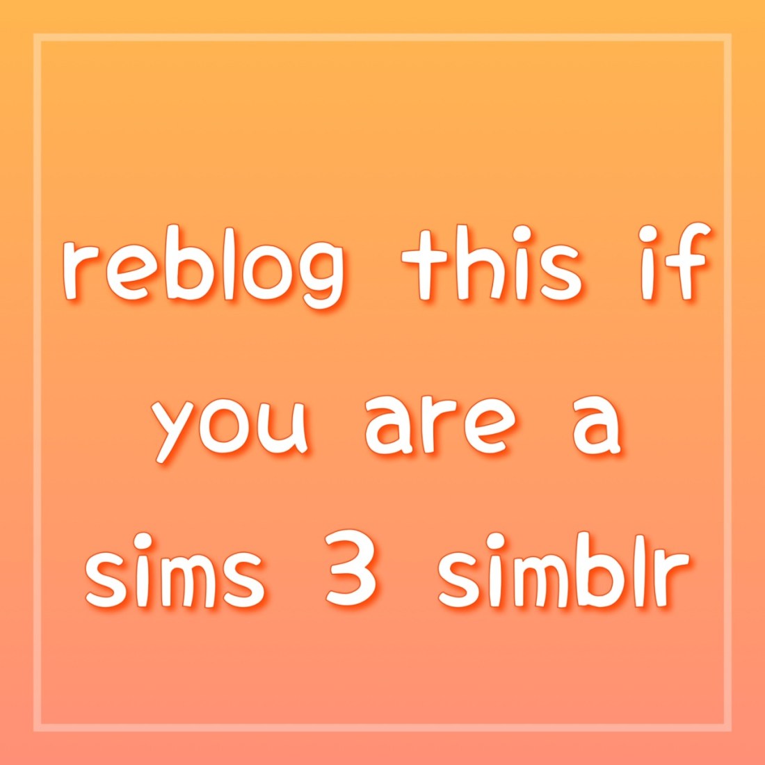 since I unfortunately lost my old account I’ve only followed 12 people and idk who to follow next and I feel like there is tumbleweed flowing across my feed so yah !!!! I’ll follow everyone (SIMS 3 BLOGS ONLY) who reblogs this(:!!