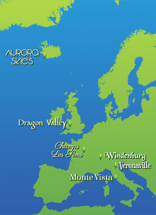 I thought it’d be fun to put the Sims worlds (from The Sims 2, 3 and 4) on the map of Europe, based on the real life locations that inspired them (and I’m always keen to download new fonts!) There are a couple of liberties taken here, so if you’re curious, here are my reasons behind these choices…