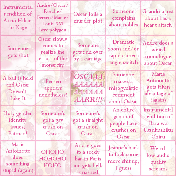 Hi yes I made a Rose of Versailles bingo, mostly because every time I joke that Fersen shows up just when you least expect him to, he winds up… actually showing up again